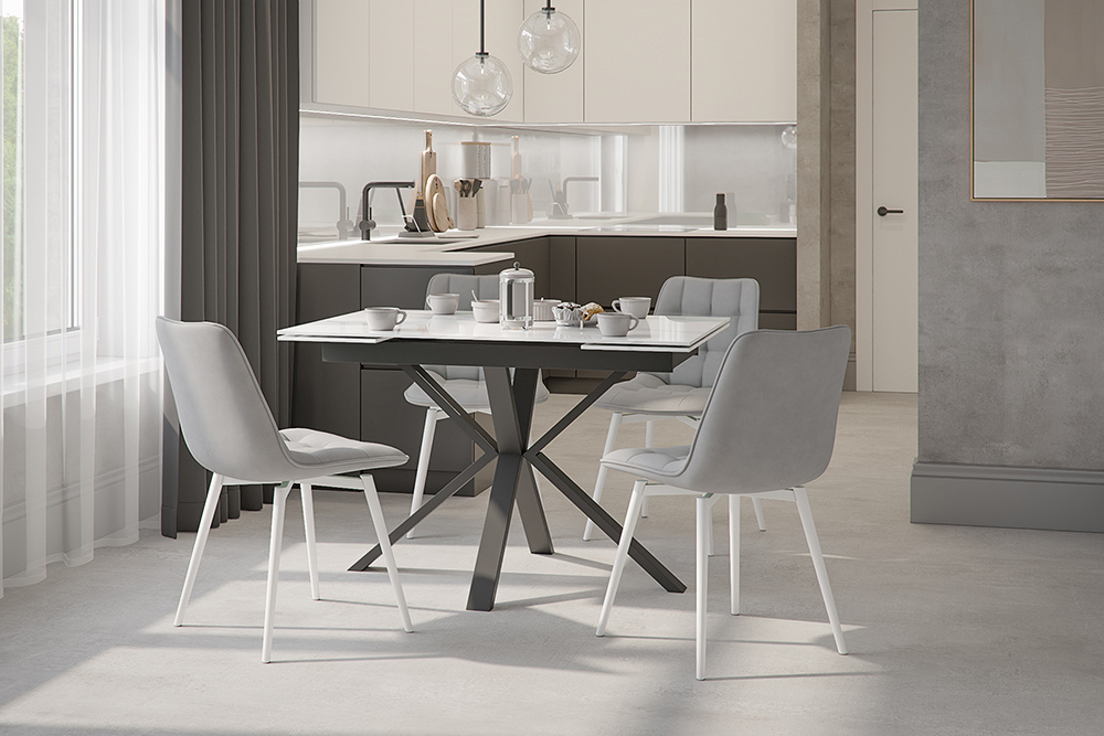Увеличение стола до 180 см позволяет легко адаптироваться к количеству гостей, делая стол идеальным для семейных ужинов и приемов. Дизайнерские изогнутые ножки добавляют столу изысканности, а белая глянцевая столешница создает привлекательный цветовой акцент.