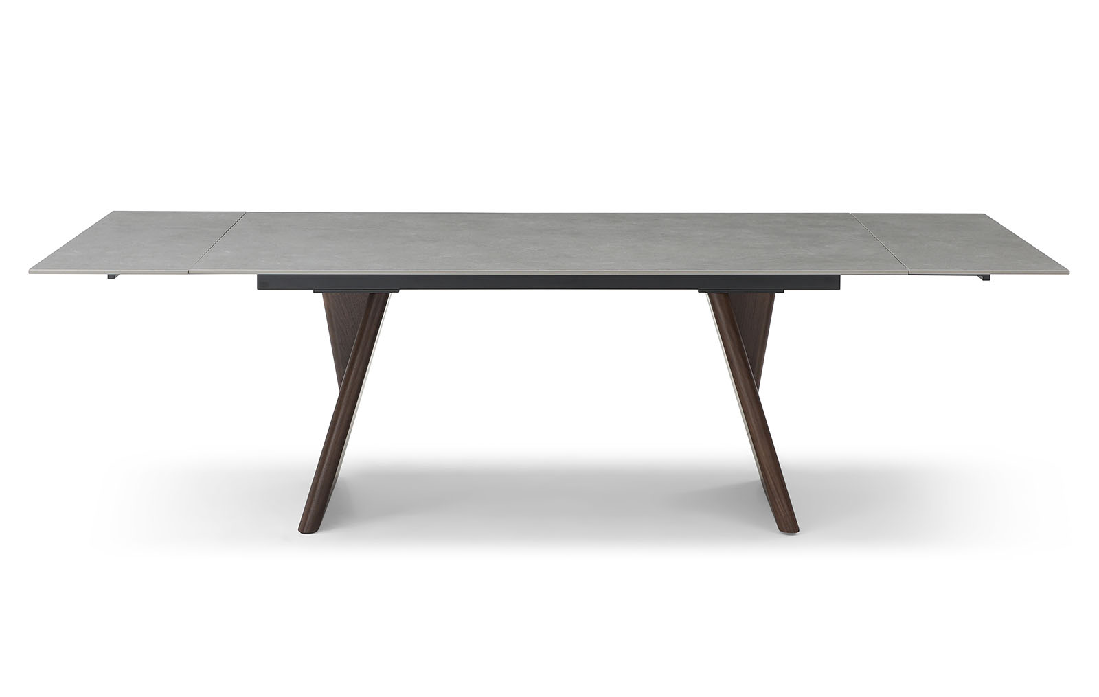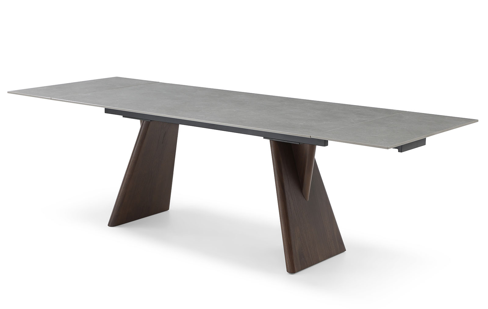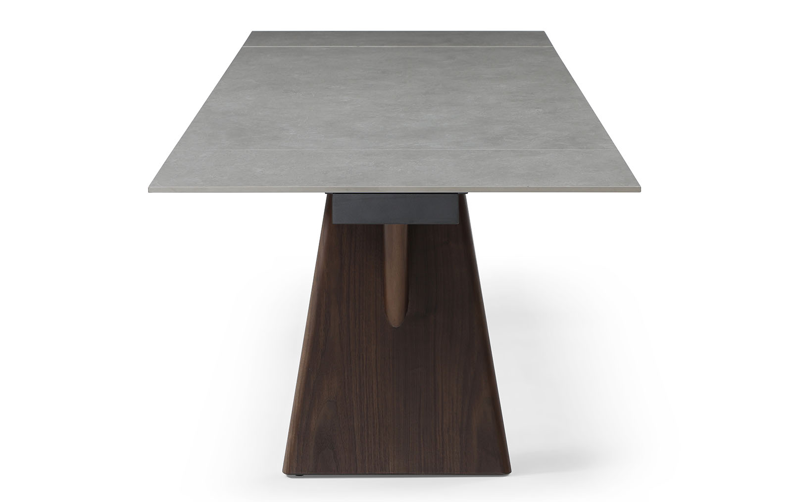 Прямоугольная столешница изготовлена из 12-миллиметровой керамики. Каркас столешницы сделан из металла, покрытого защитным напылением, а устойчивые ножки из многослойной фанеры декорированы натуральным шпоном ореха.