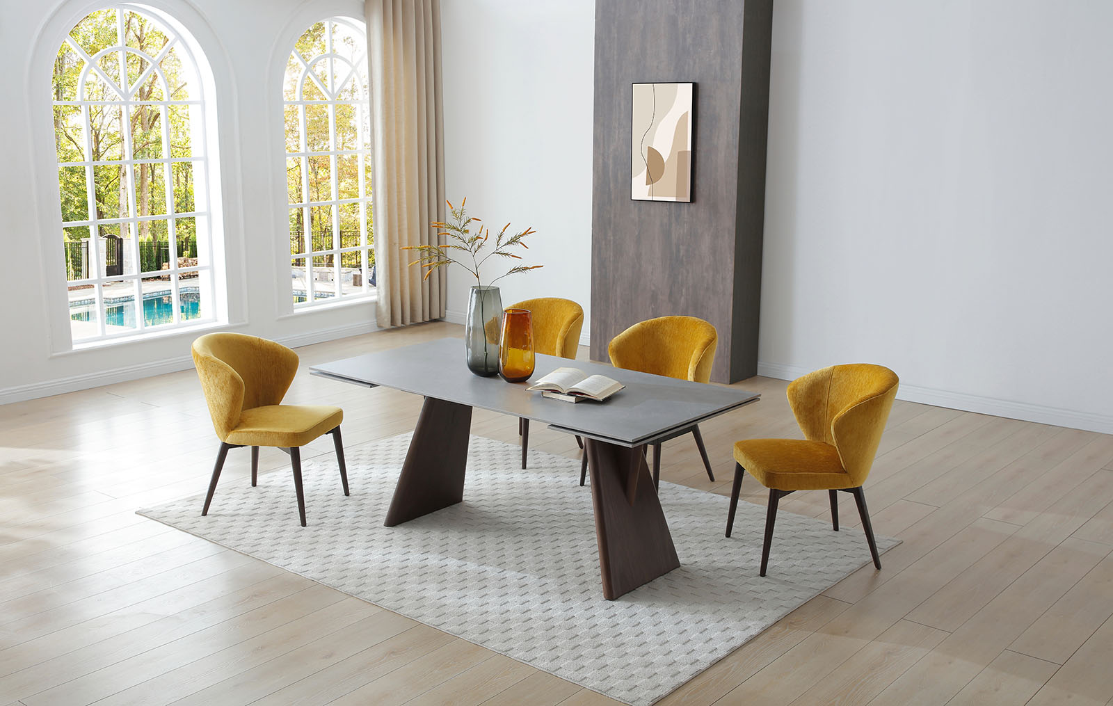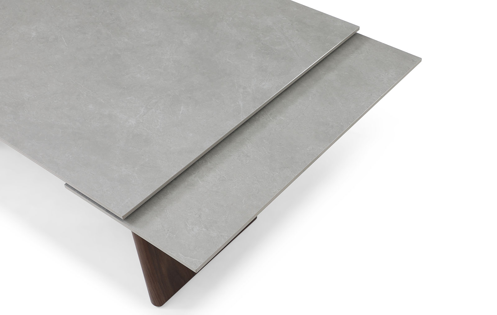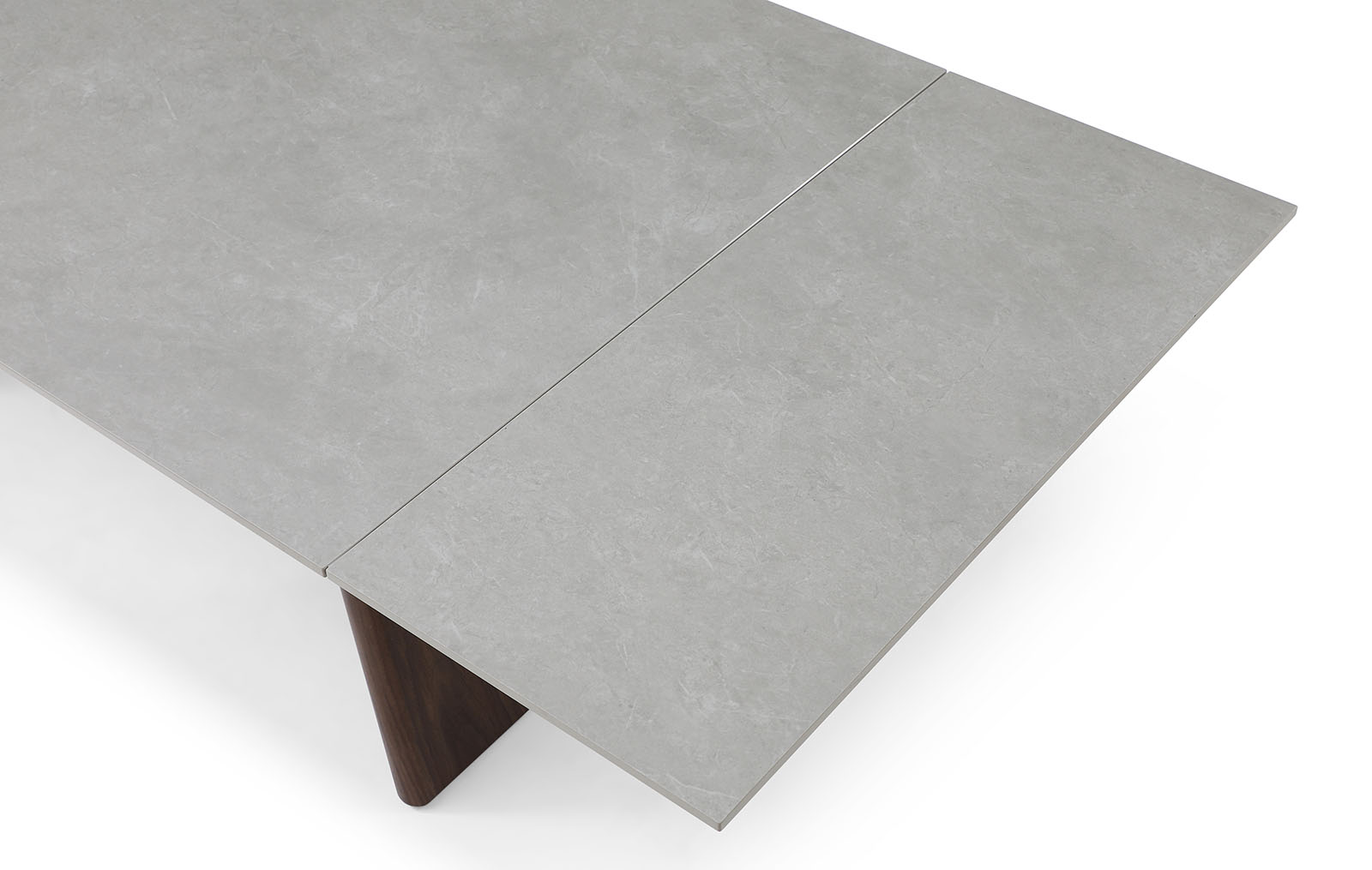 Прямоугольная столешница изготовлена из 12-миллиметровой керамики. Каркас столешницы сделан из металла, покрытого защитным напылением, а устойчивые ножки из многослойной фанеры декорированы натуральным шпоном ореха.