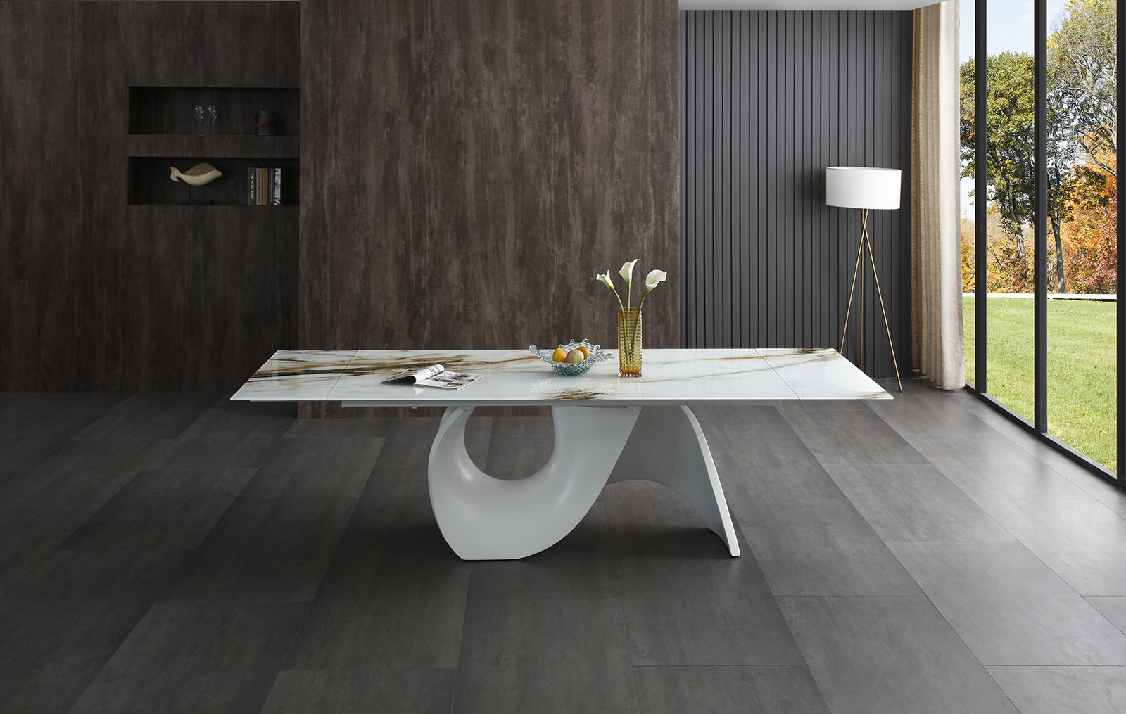 Важный элемент дизайна этого стола – практичная столешница из ультра белого закаленного стекла с 3D печатью, толщиной 10 мм.