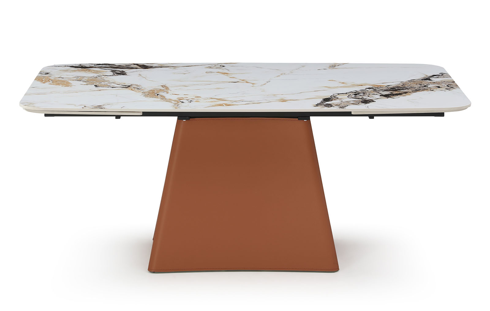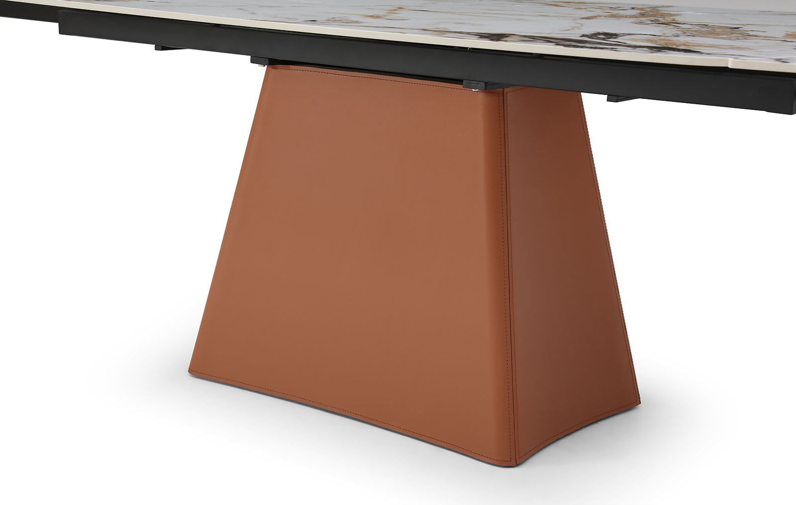 Основное преимущество такого стола – практичная керамическая столешница, отличающаяся износостойкостью, долговечностью, устойчивостью к внешним воздействиям. Столешница прямоугольной формы сделана из керамики толщиной 12 мм на металлическом каркасе. Ножка стола из металла, декорирована искусственной кожей.