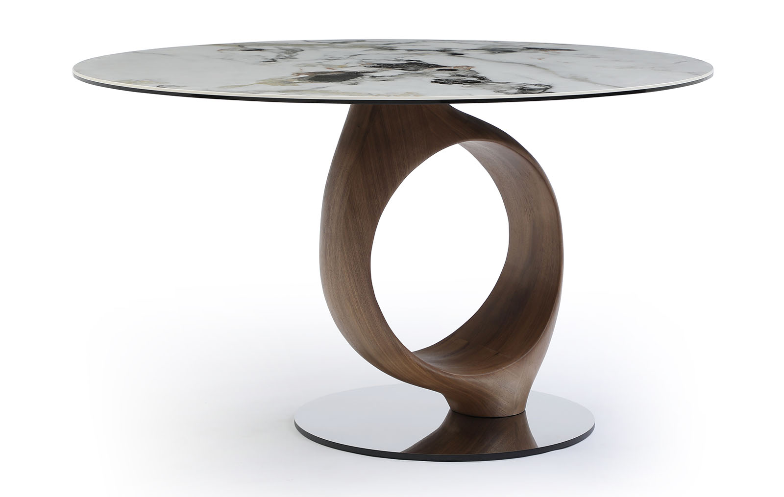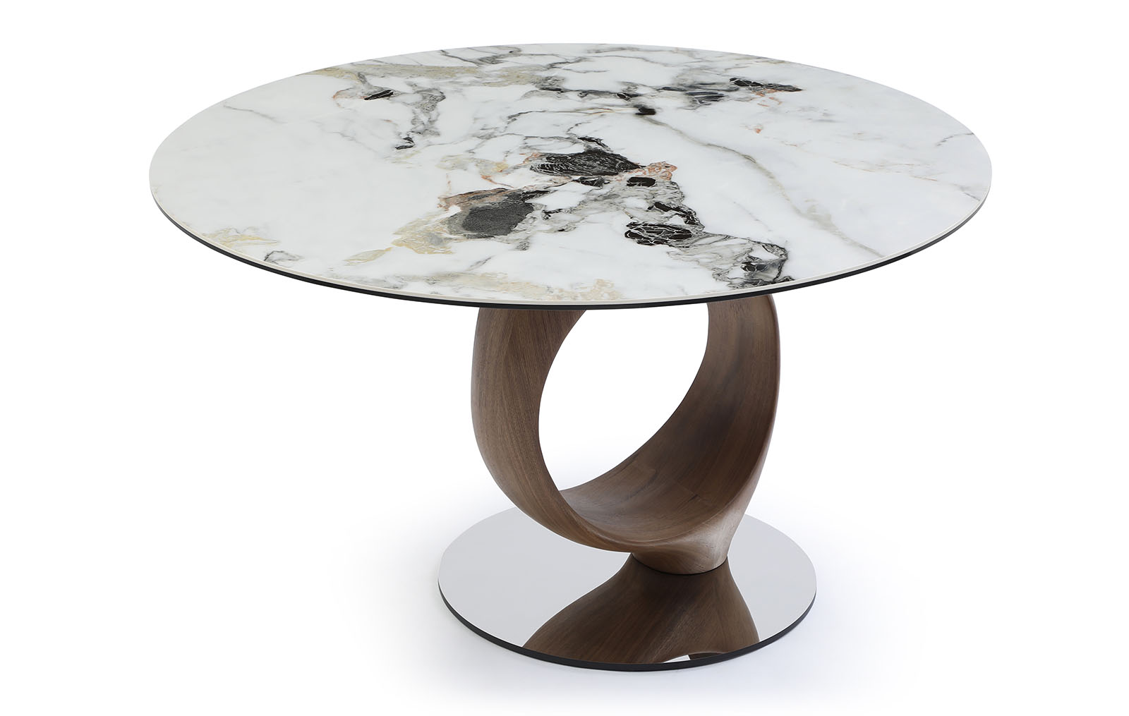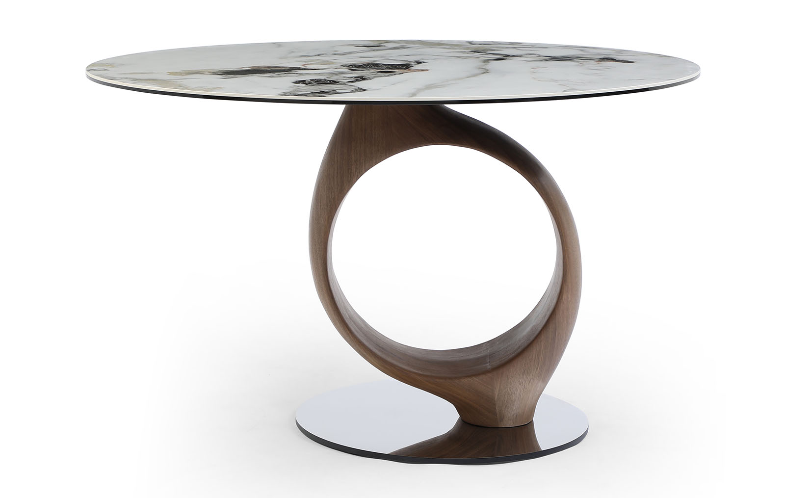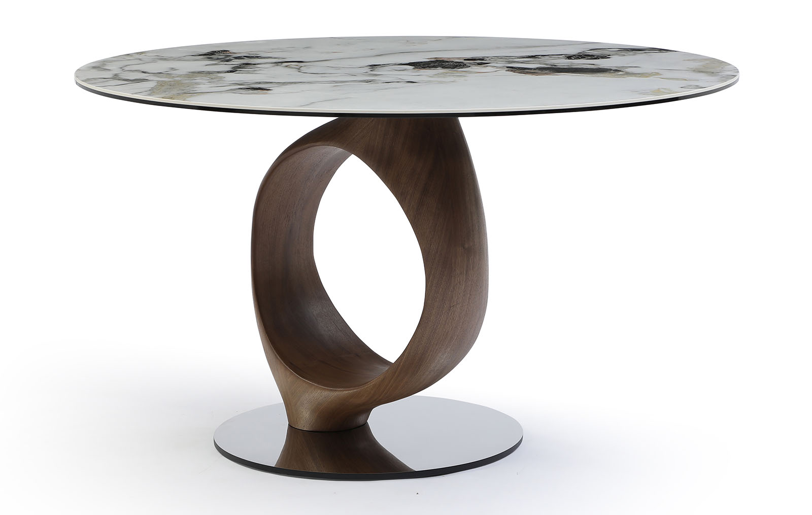 Круглая столешница из керамики светлых оттенков и стекла имеет общую толщину 14 мм и диаметр 130 см. Ножка сделана из стекловолокна и шпона ореха. Небольшое блестящее основание круглой формы изготовлено из нержавеющей стали.