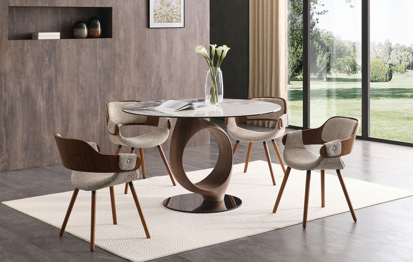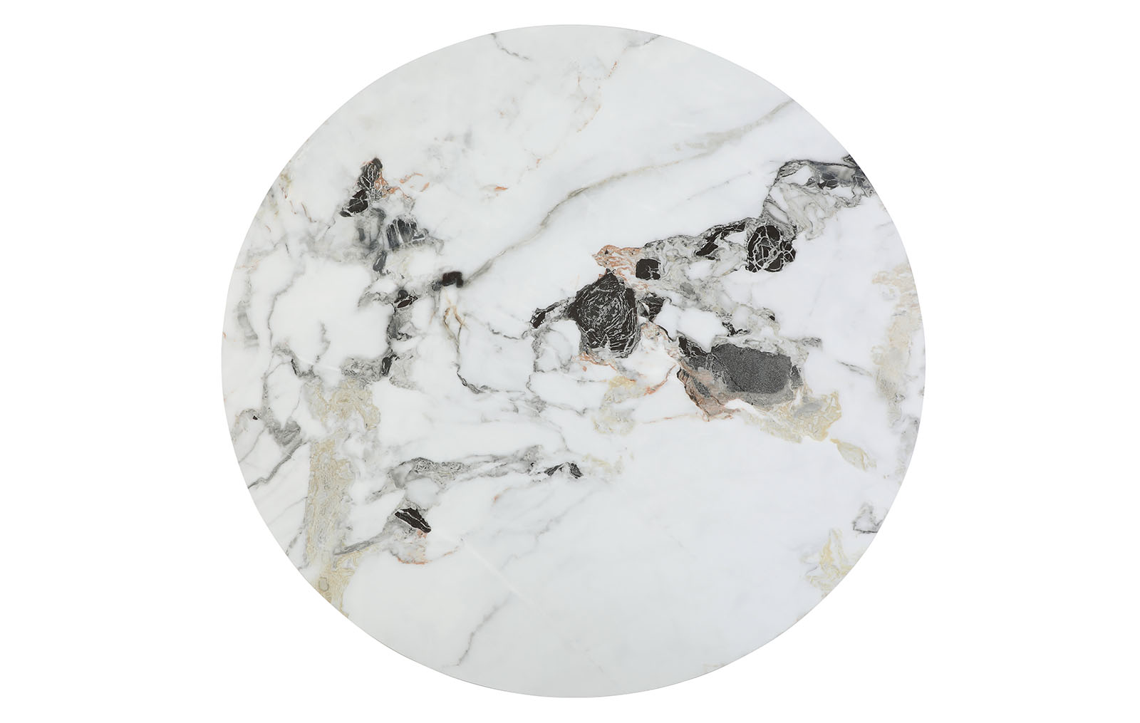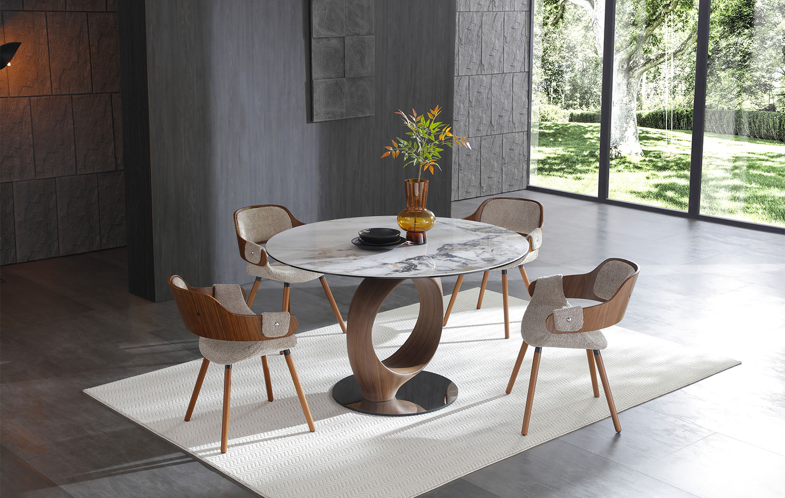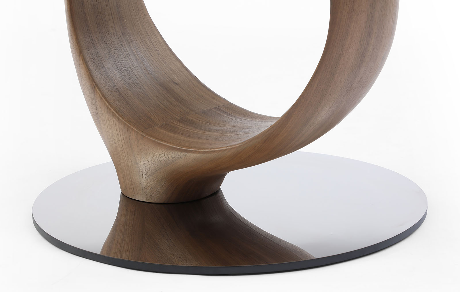 Круглая столешница из керамики светлых оттенков и стекла имеет общую толщину 14 мм и диаметр 130 см. Ножка сделана из стекловолокна и шпона ореха. Небольшое блестящее основание круглой формы изготовлено из нержавеющей стали.