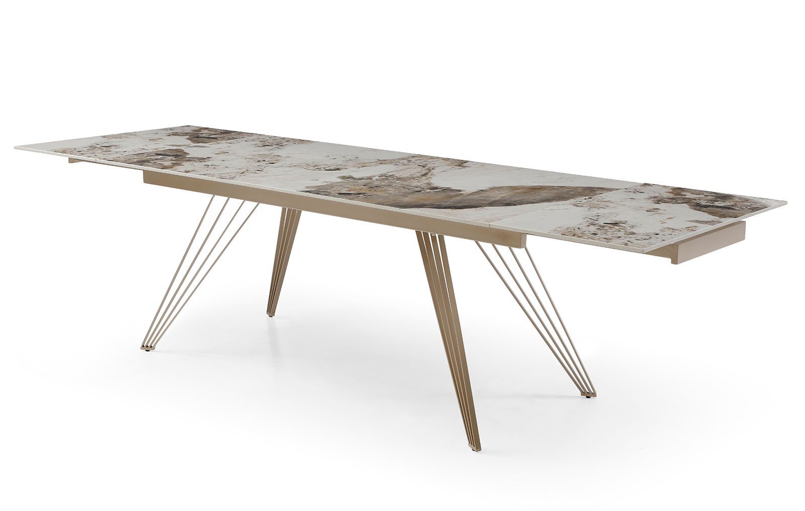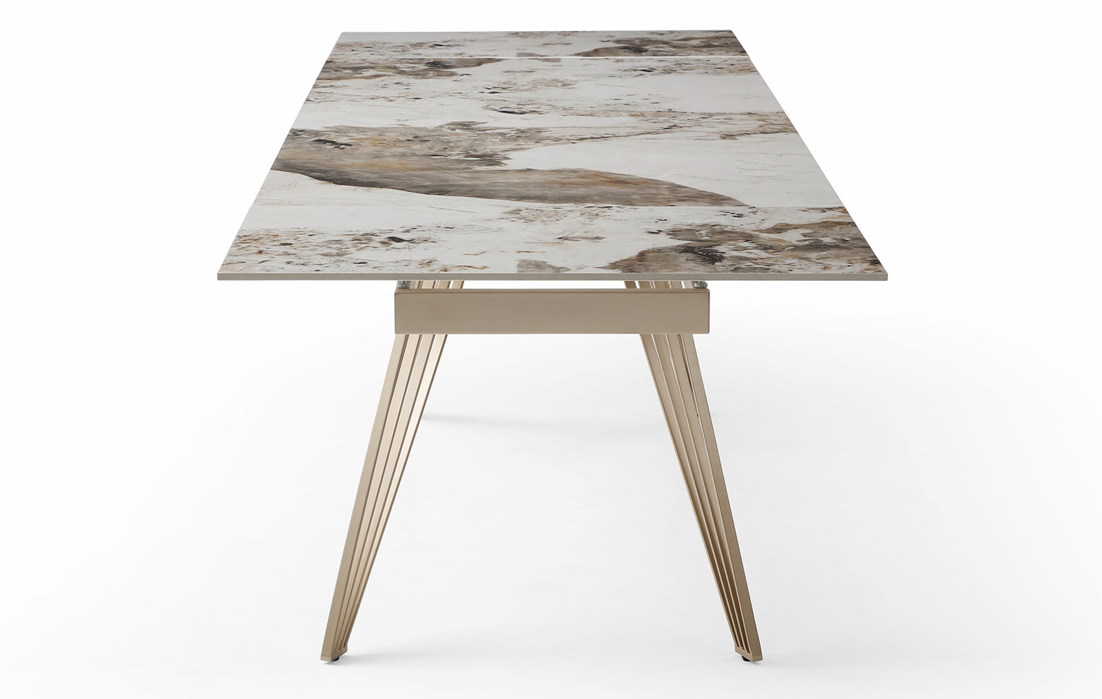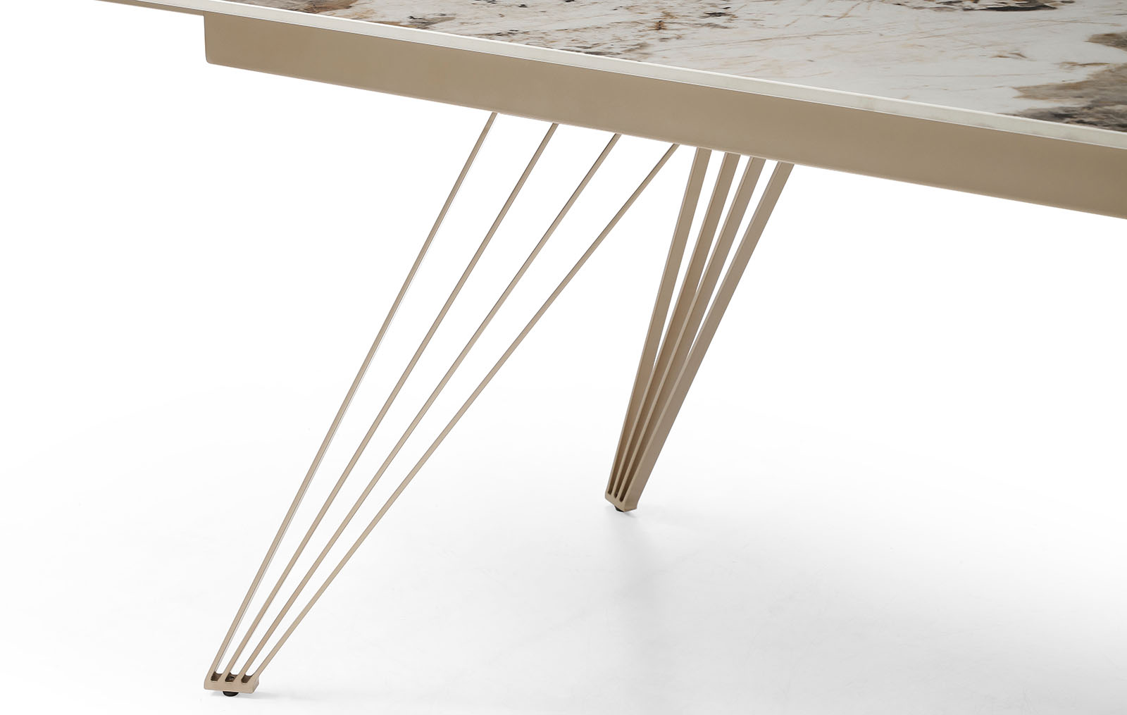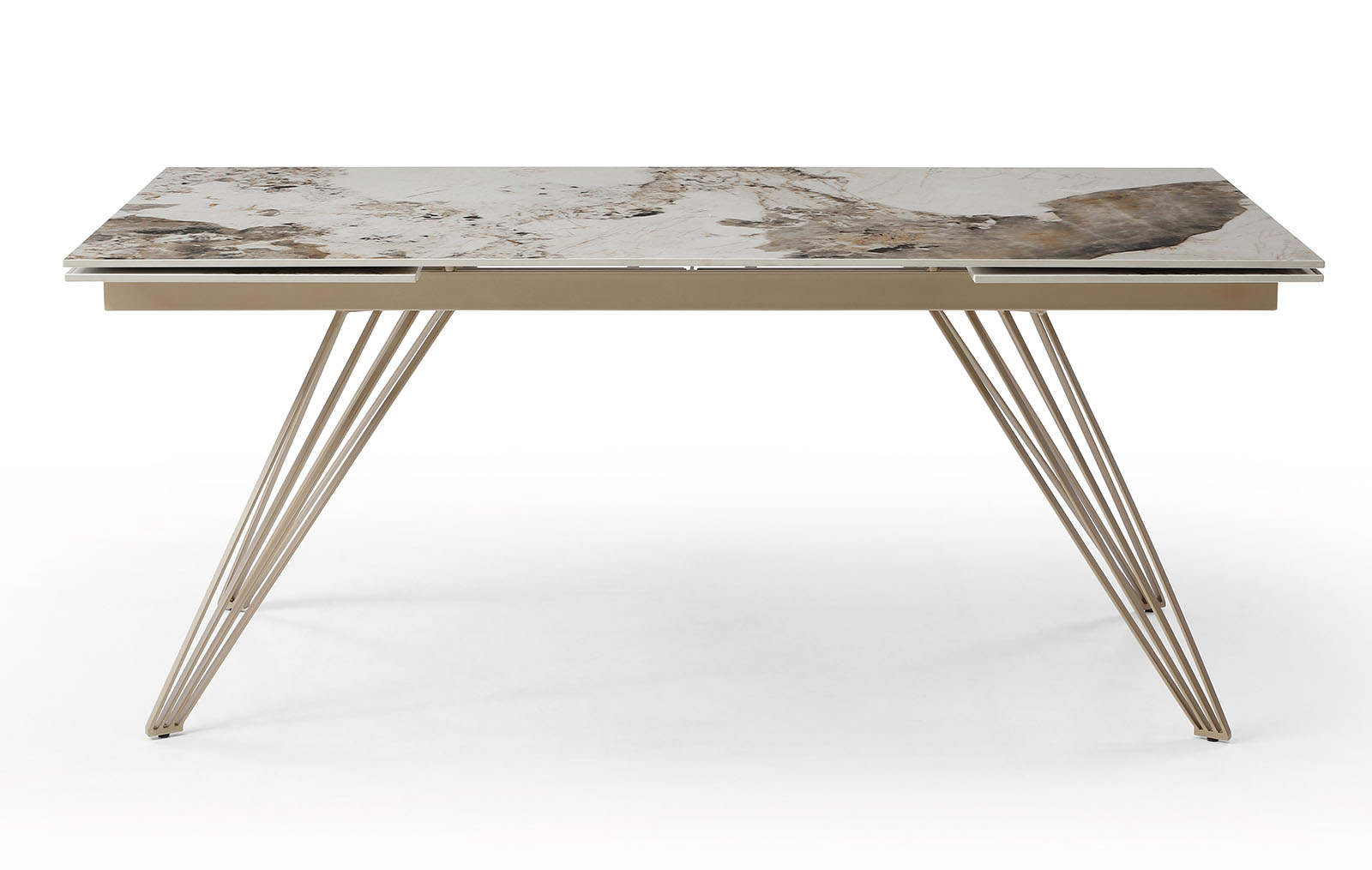 Раскладной обеденный стол Parma с керамической столешницей из глянцевой керамики и металлическими ножками, состоящими из множества тонких прутиков, в оттенке золотистый шампань — отличный выбор для украшения кухни, столовой, гостиной.