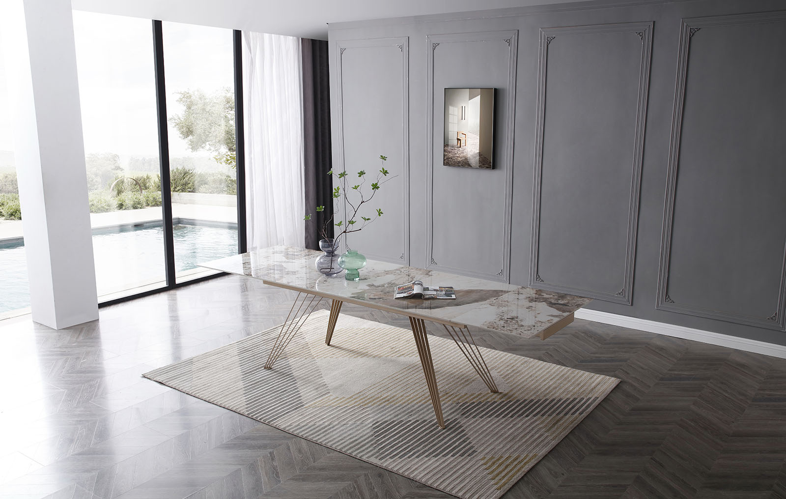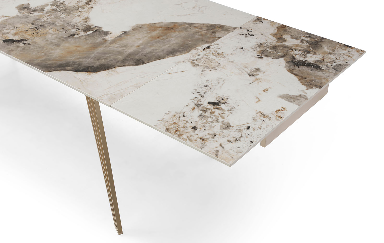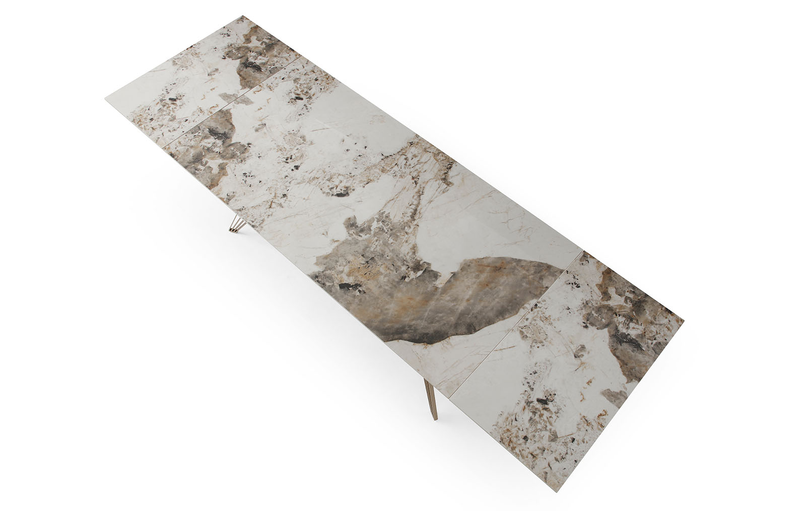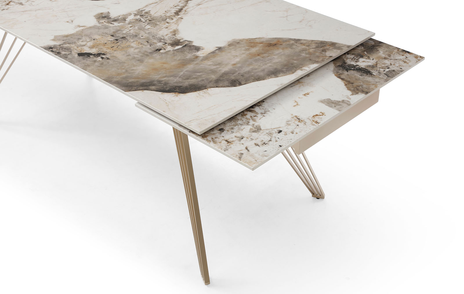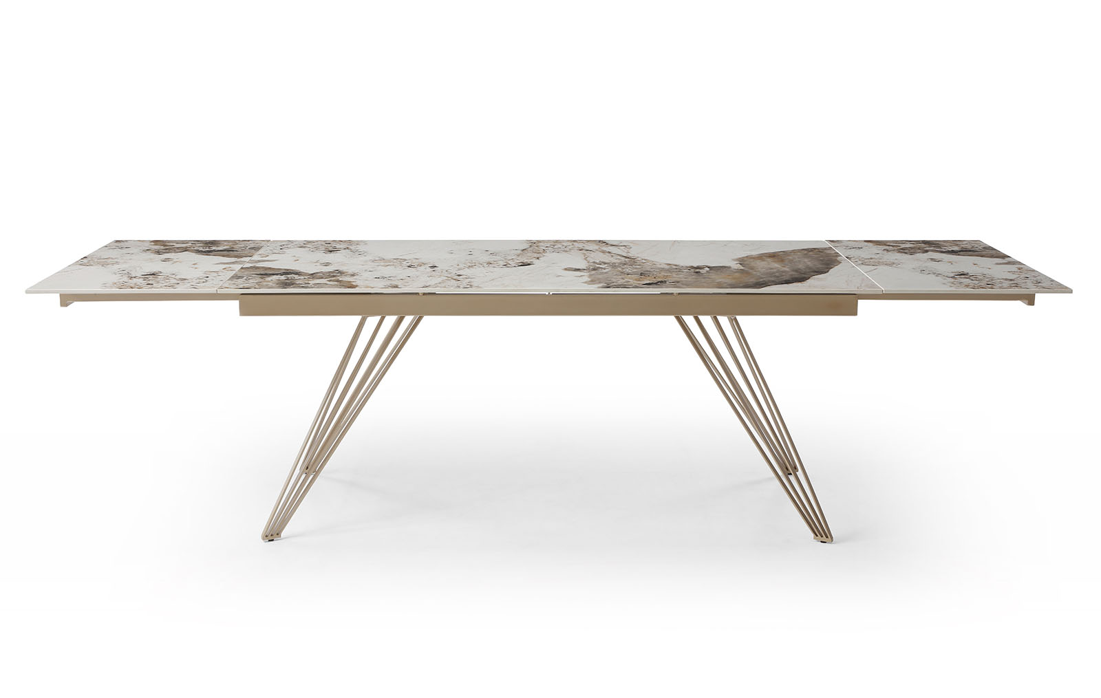 Раскладной обеденный стол Parma с керамической столешницей из глянцевой керамики и металлическими ножками, состоящими из множества тонких прутиков, в оттенке золотистый шампань — отличный выбор для украшения кухни, столовой, гостиной.