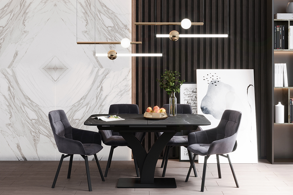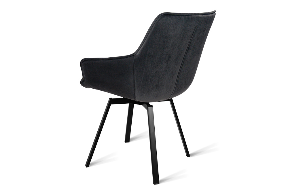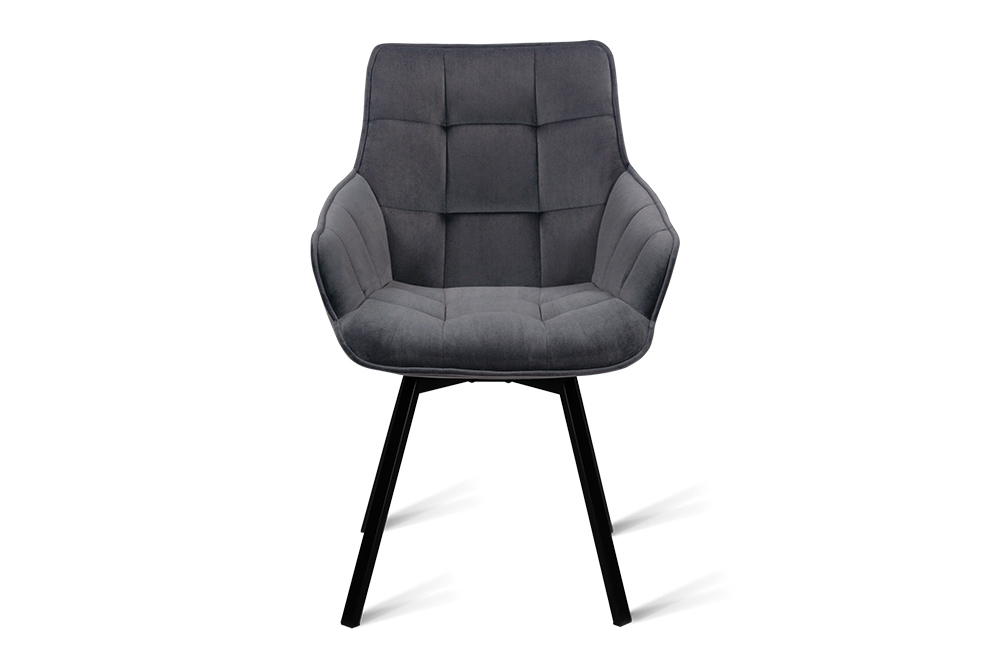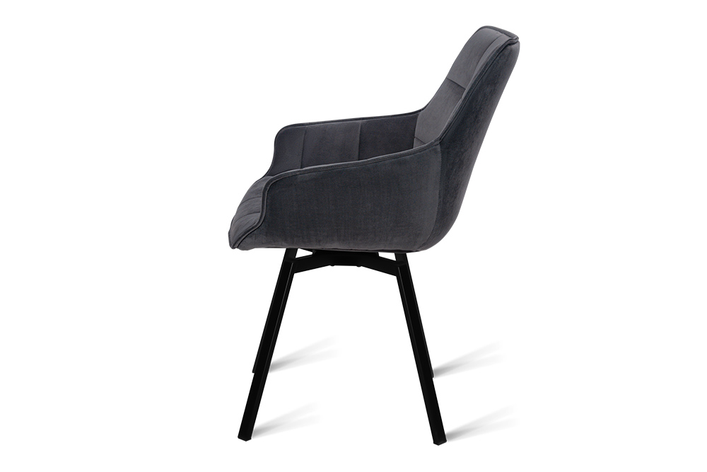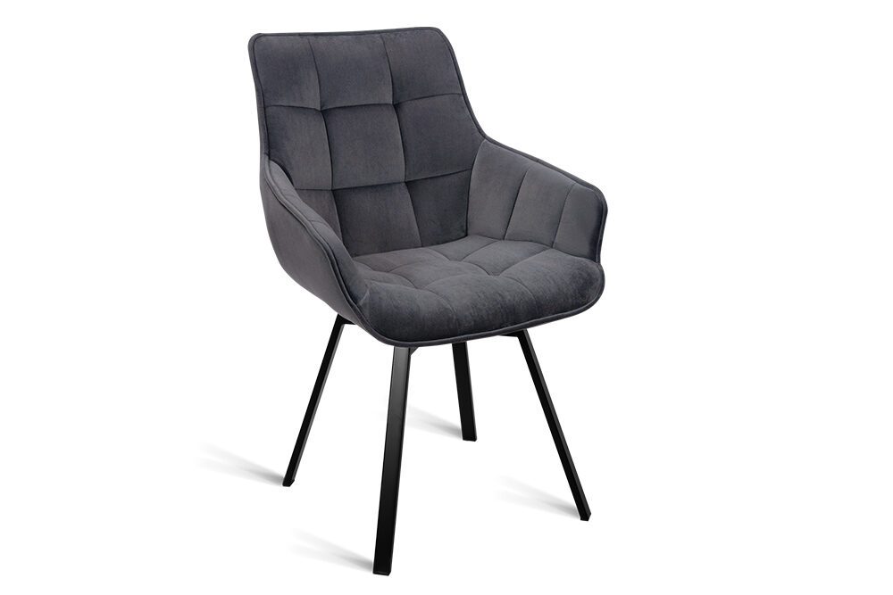 Дизайнерский стул с металлическим каркасом с поворотным сиденьем. Изготовлен в актуальной манере, обивка – люксовый велюр темно-серого цвета. Ножки из металлического сплава в виде расходящихся лучей. Обивка оформлена в оригинальной стеганной манере.