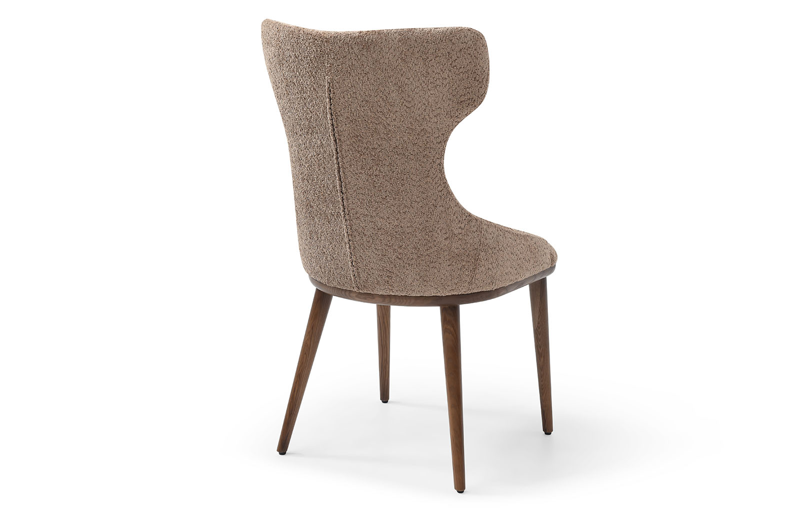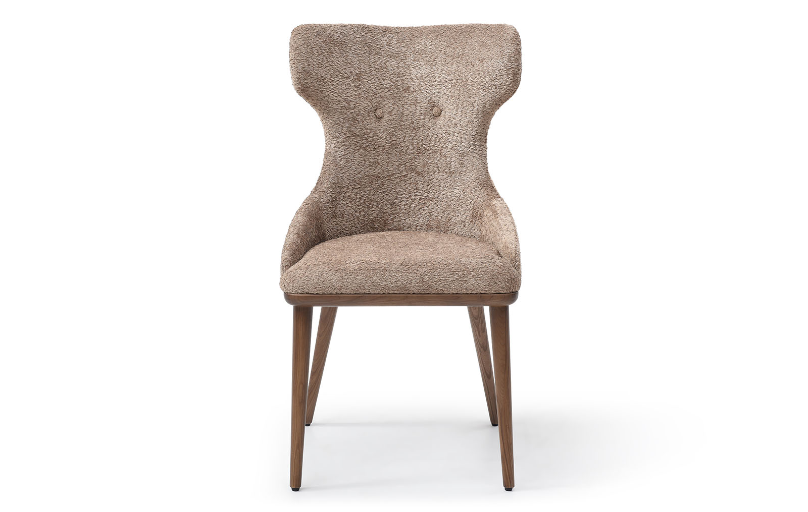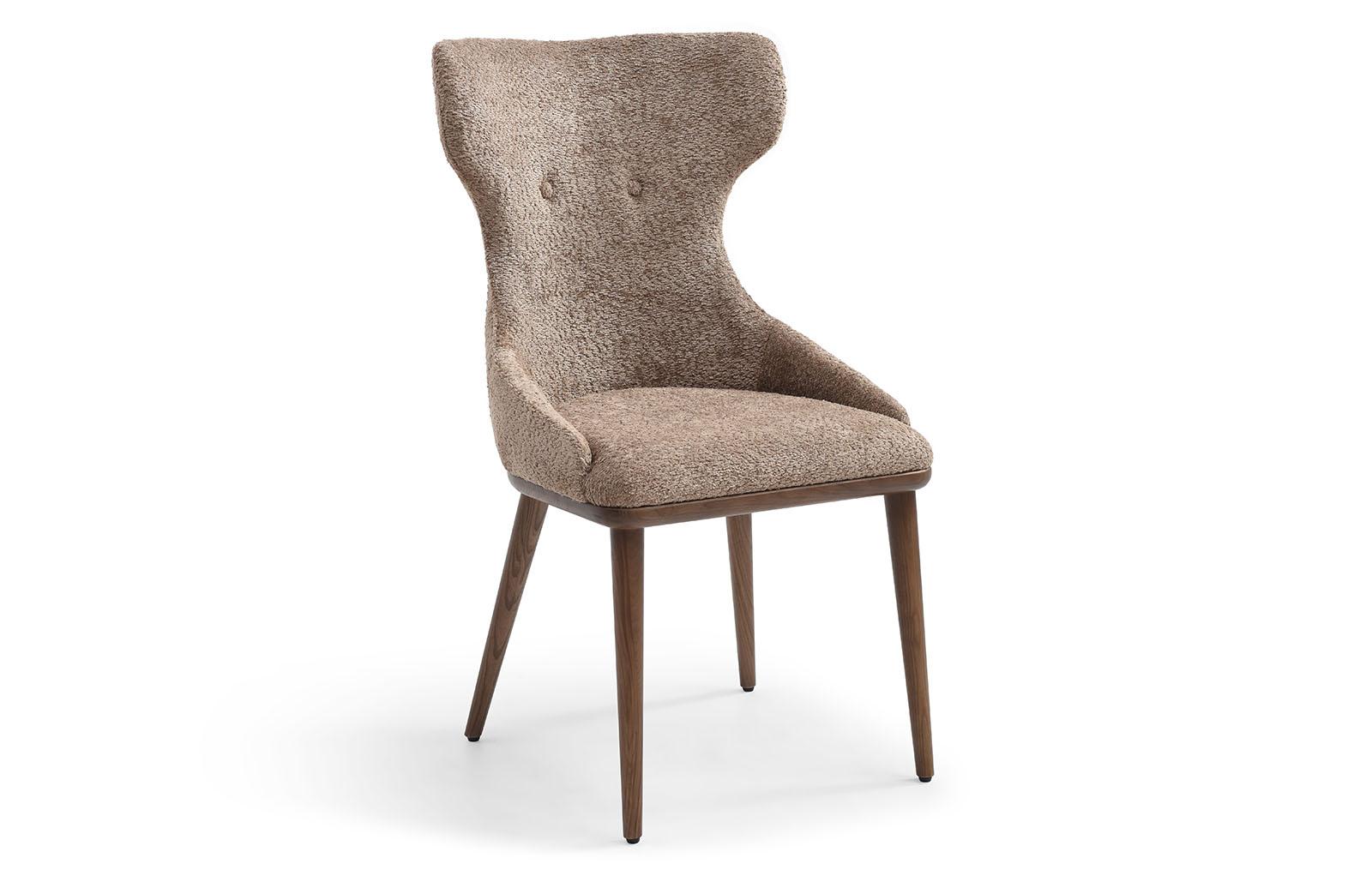Обеденный стул Augusta имеет обивку из ткани тедди в оттенке капучино и ножки из дерева в оттенке ореха. Стул имеет удобную высокую спинку с «ушками», на которую можно с комфортом облокотиться. Спинка украшена двумя декоративными пуговицами.