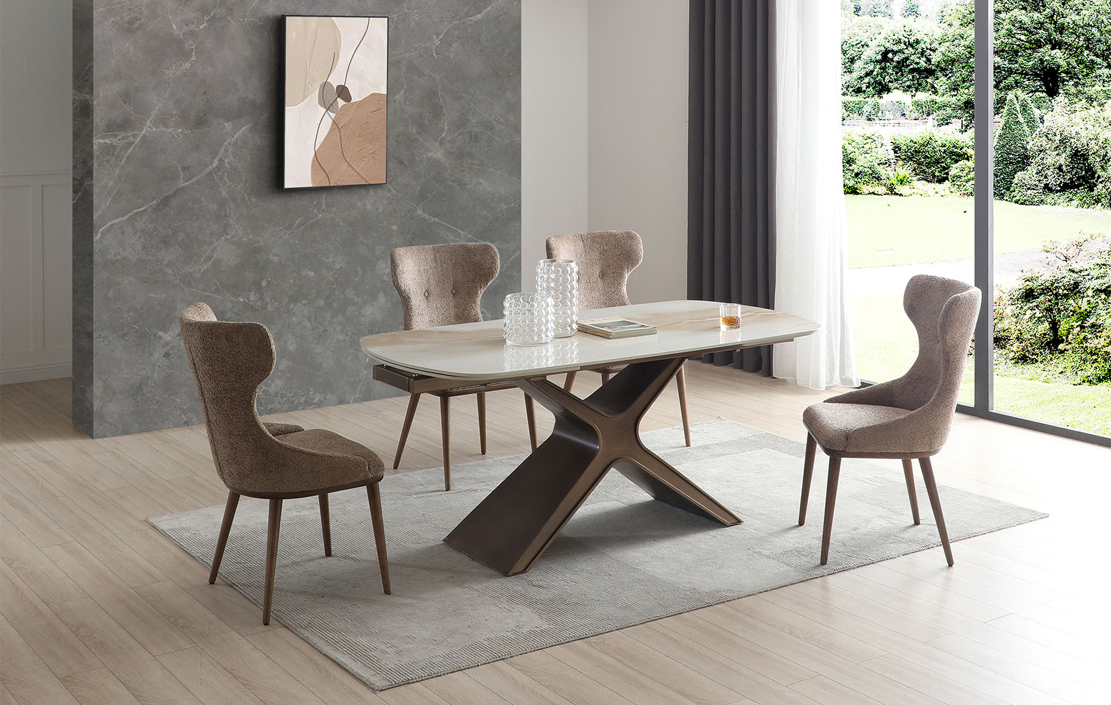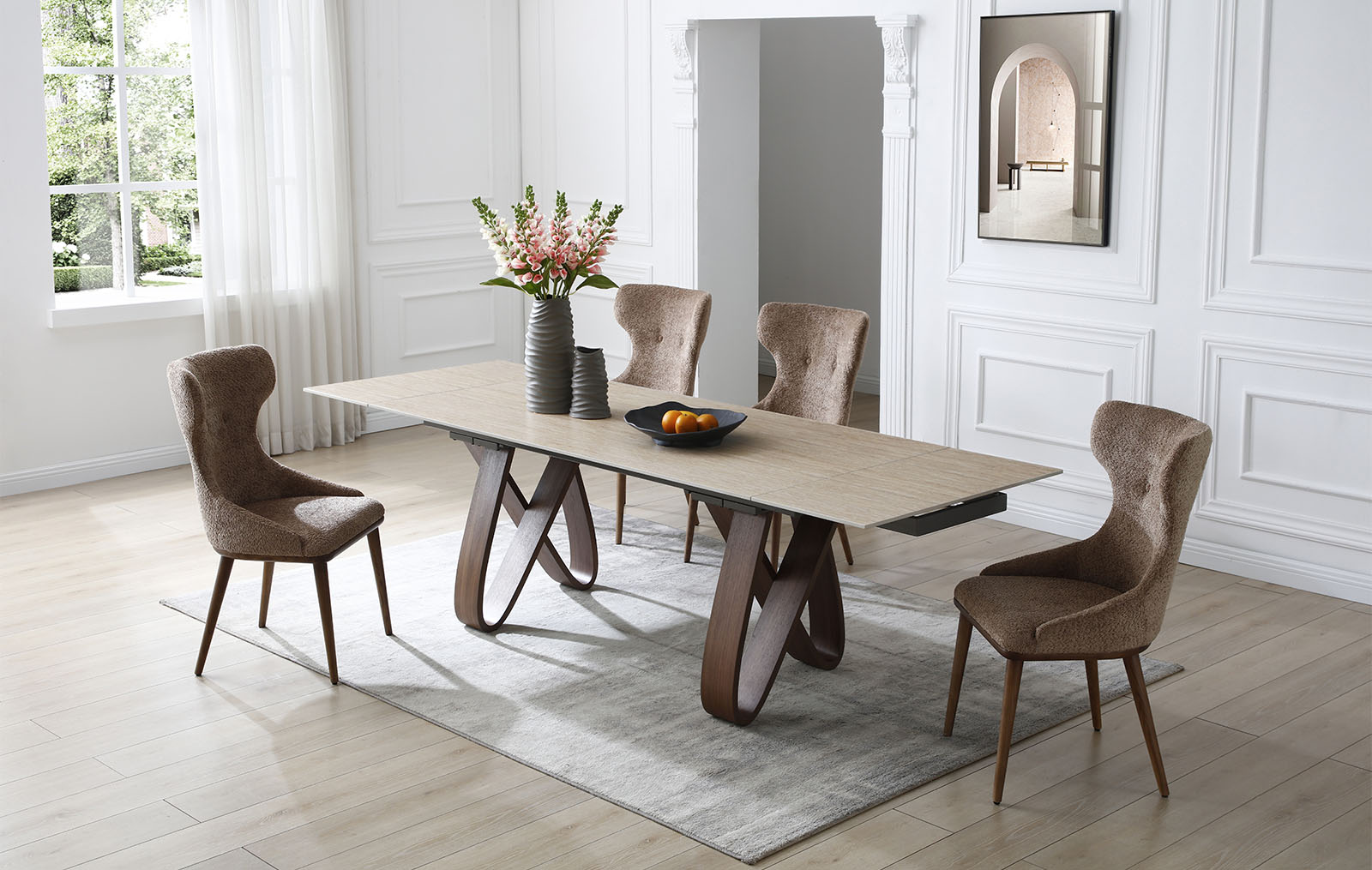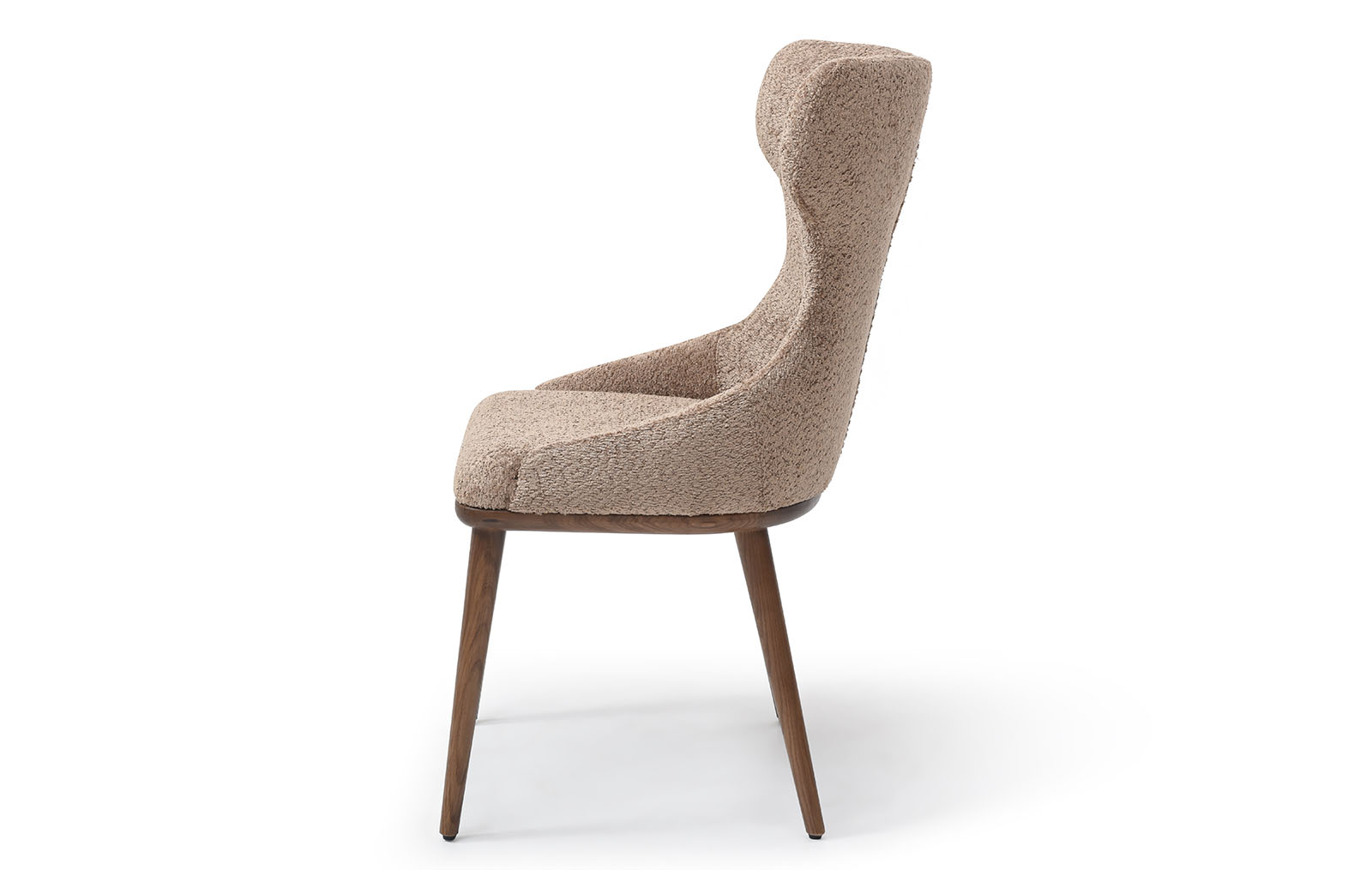 Обеденный стул Augusta имеет обивку из ткани тедди в оттенке капучино и ножки из дерева в оттенке ореха. Стул имеет удобную высокую спинку с «ушками», на которую можно с комфортом облокотиться. Спинка украшена двумя декоративными пуговицами.