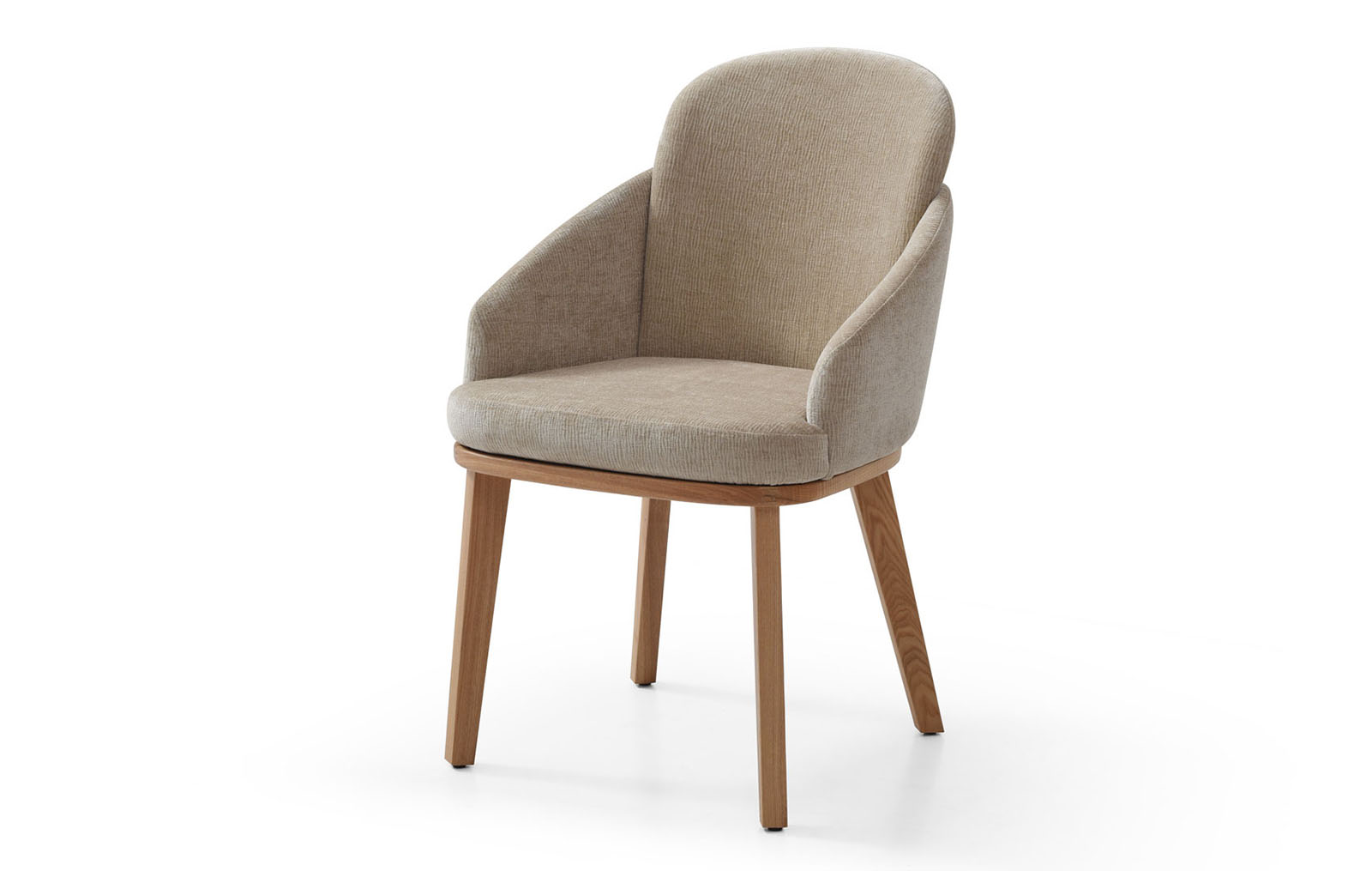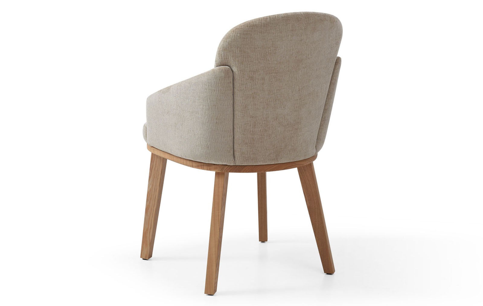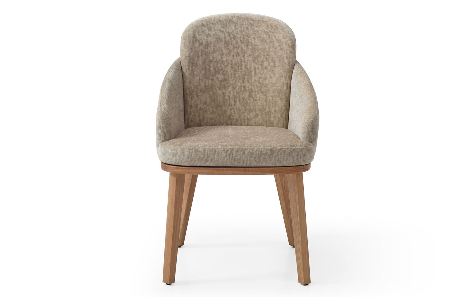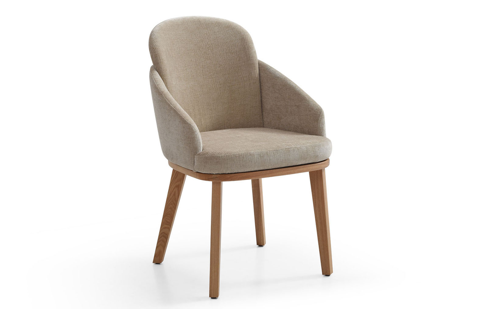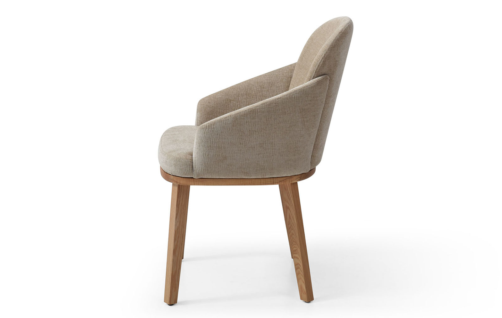 Обеденный стул Clarissa имеет обивку из фактурной бежевой ткани и ножки из дерева, тонированные в оттенок ореха.