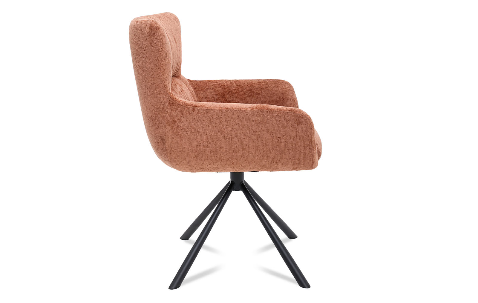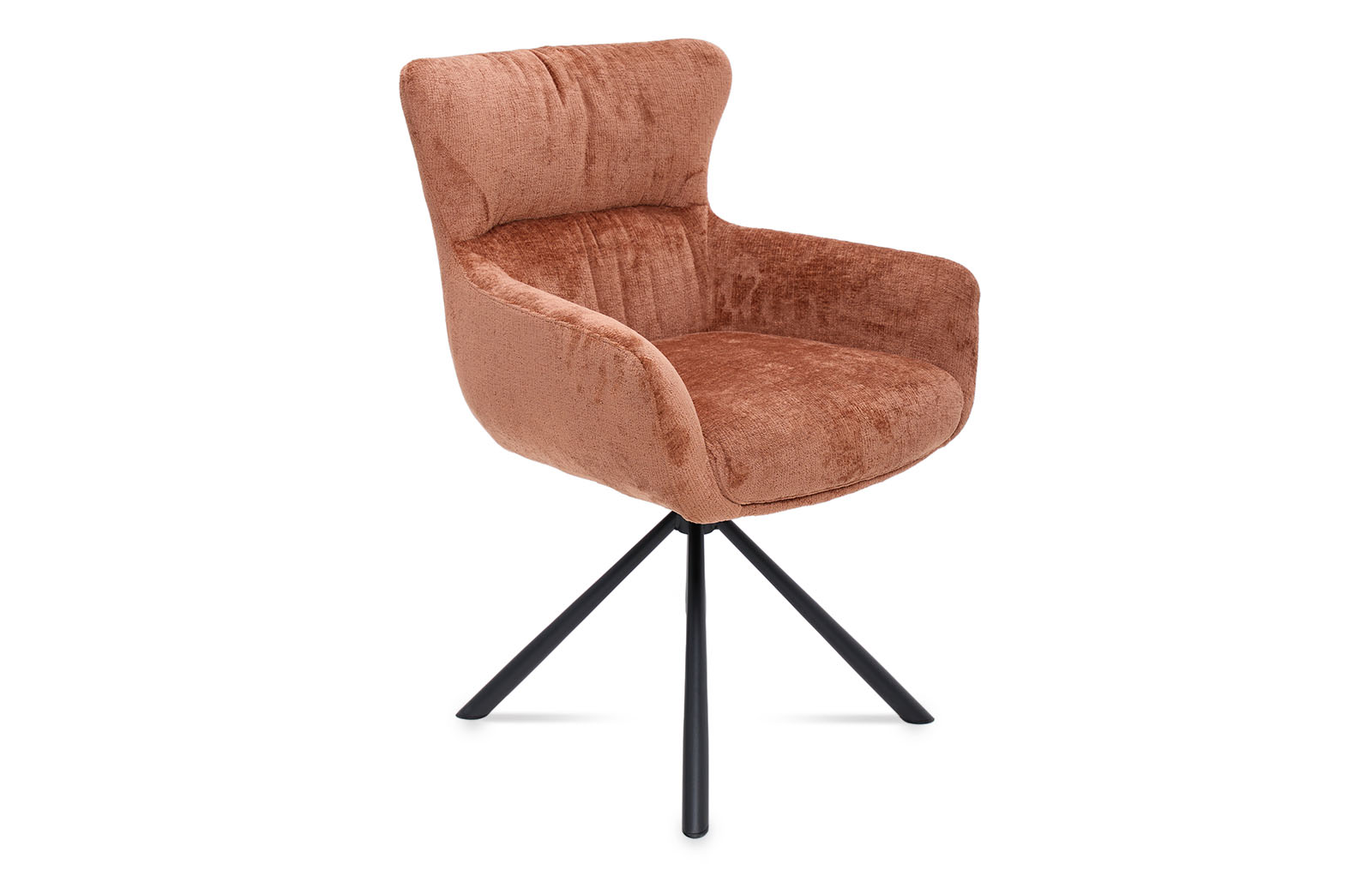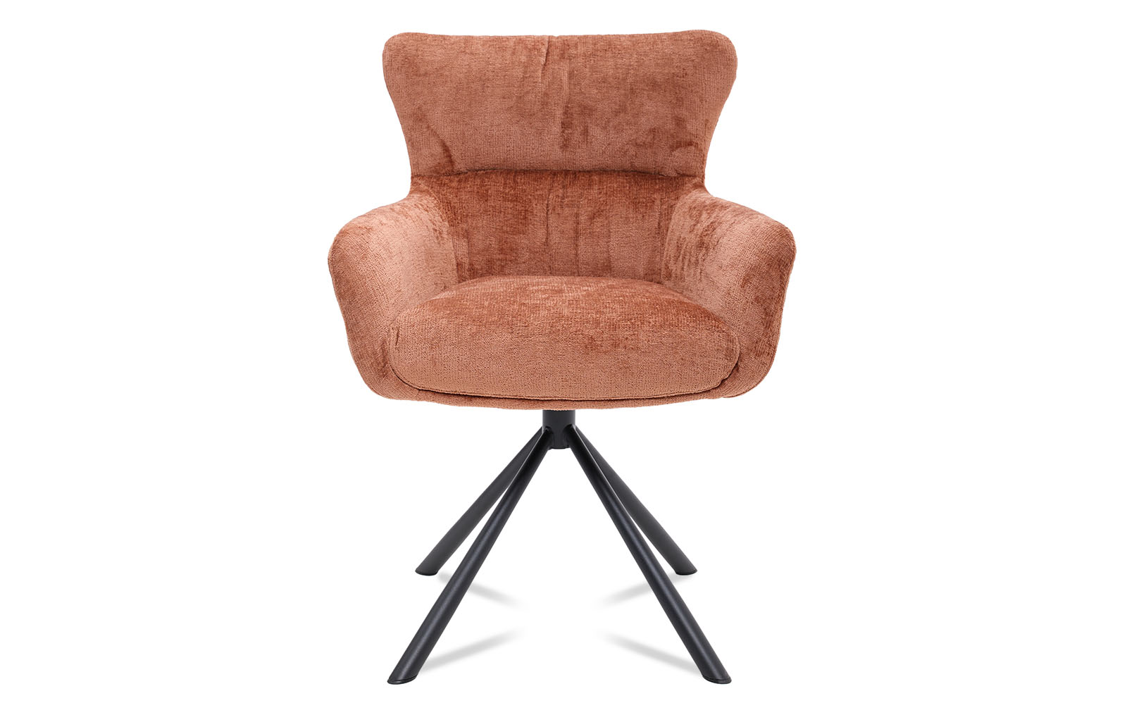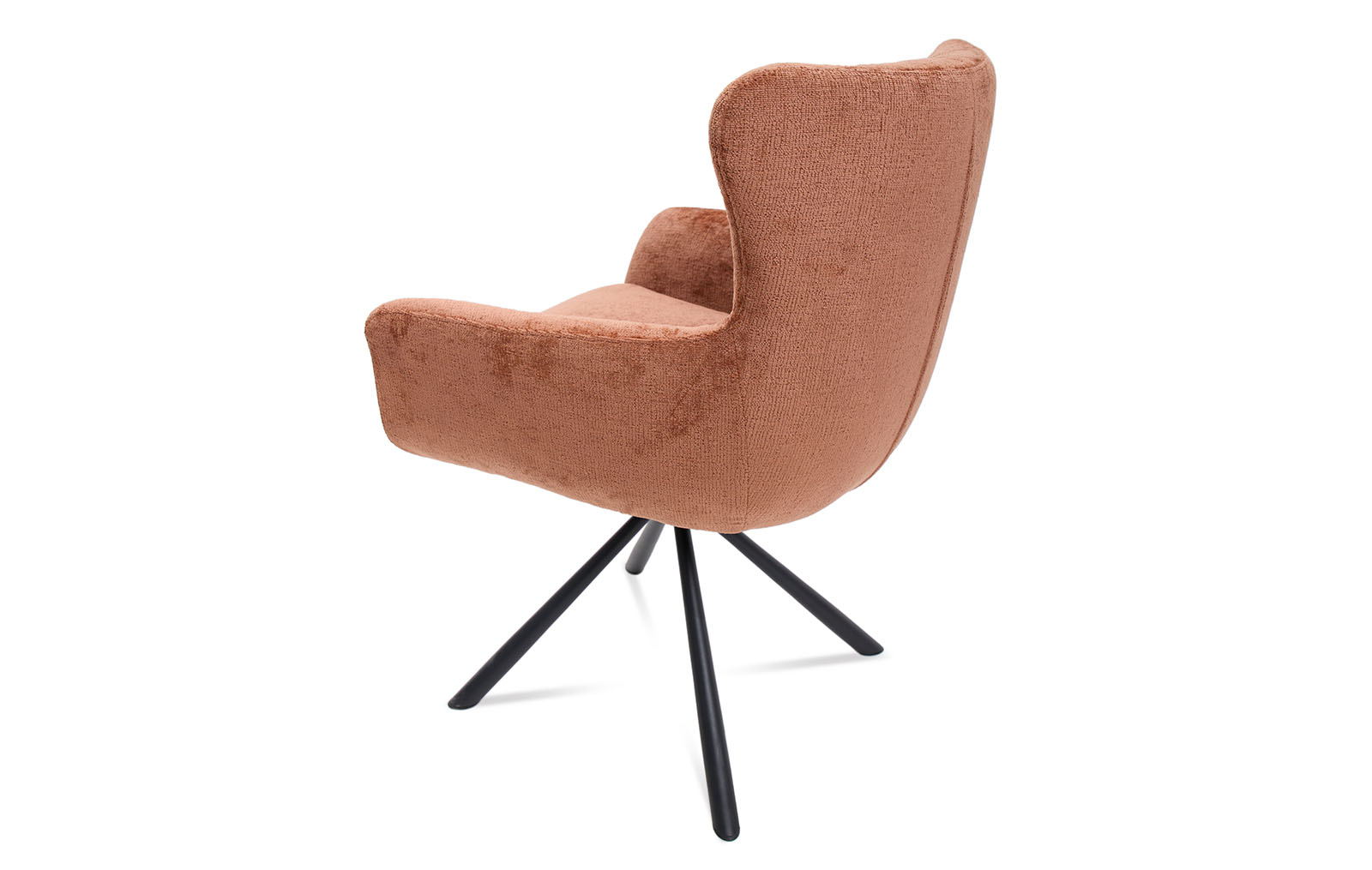 Стул Glenda может поворачиваться на 180° и возвращаться в исходное положение, благодаря поворотно-возвратному механизму. Такой стул удобно использовать и с обеденными, и с письменными столами. Приятная на ощупь акцентная обивка терракотового цвета привлекает внимание. Сиденье снабжено пружинами карманного типа. Ножки из металла с матовым черным напылением.