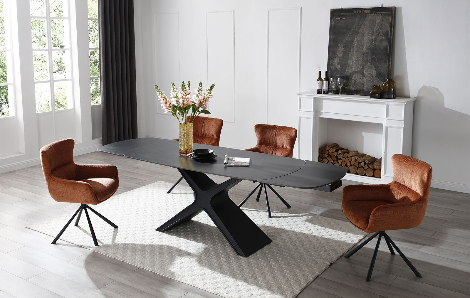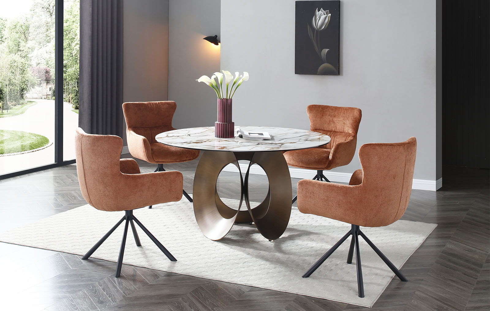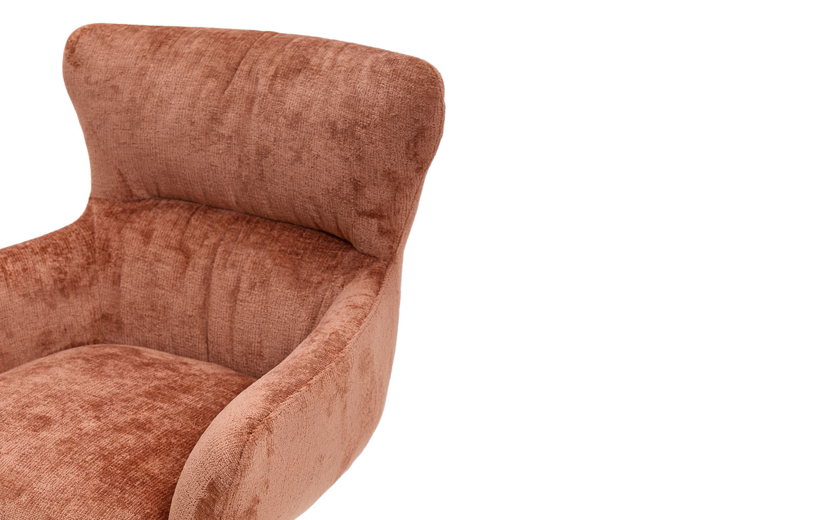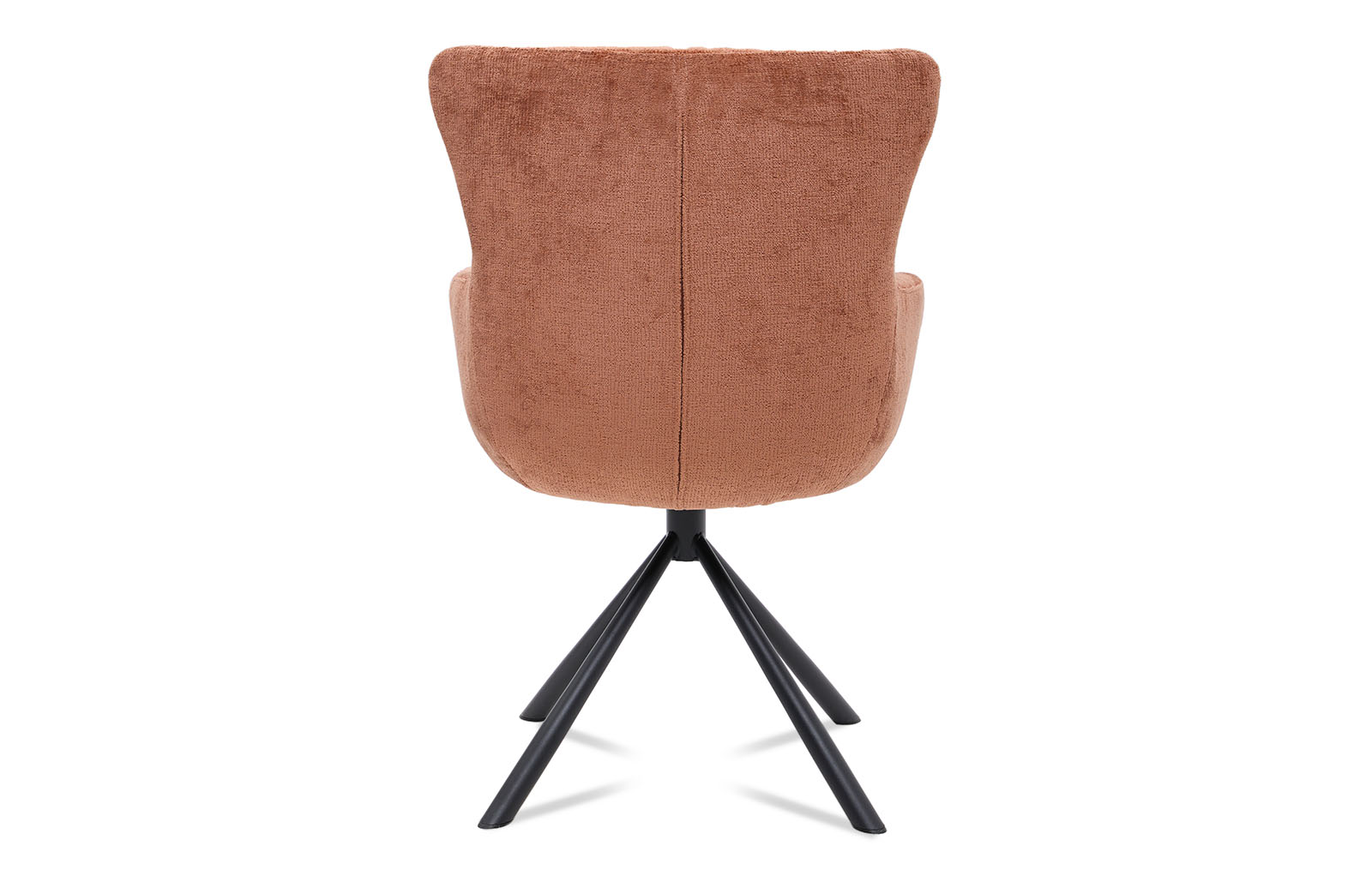 Стул Glenda может поворачиваться на 180° и возвращаться в исходное положение, благодаря поворотно-возвратному механизму. Такой стул удобно использовать и с обеденными, и с письменными столами. Приятная на ощупь акцентная обивка терракотового цвета привлекает внимание. Сиденье снабжено пружинами карманного типа. Ножки из металла с матовым черным напылением.