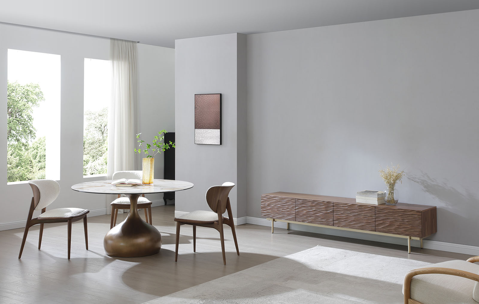 Стул Ian вдохновлён эстетикой Mid Century Modern — идеален для интерьеров, где важны линии, фактуры и аутентичность. Каркас из ясеня обеспечивает устойчивость и надежность. Мягкая обивка из ткани тедди добавляет не только комфорта, но и тактильной глубины. Это не просто стул, это деталь, которая говорит за весь интерьер. Лёгкий визуально, надёжный конструктивно, он будет уместен в современной кухне, арт-пространстве гостиной или за дизайнерским столом в обеденной зоне.