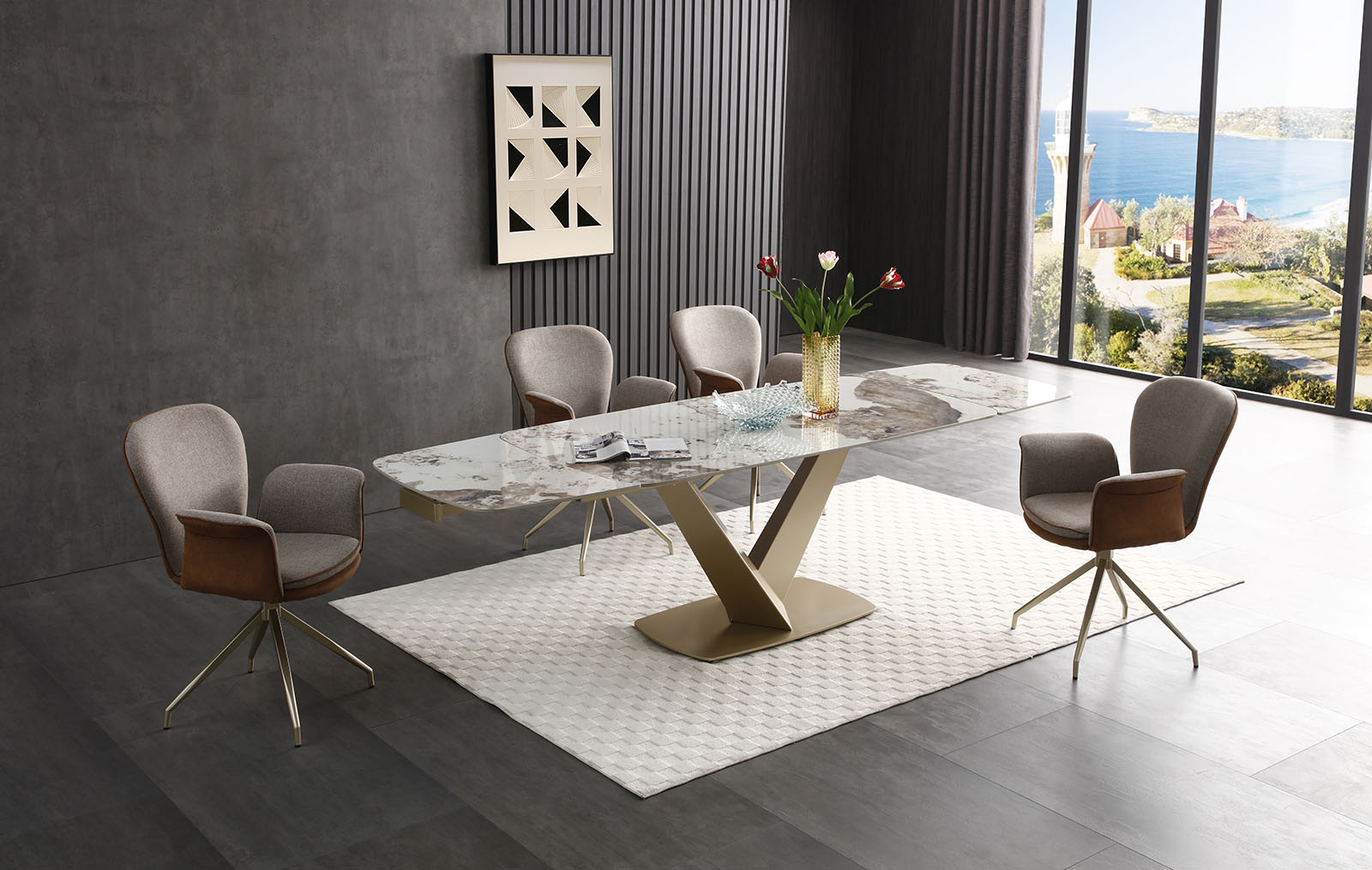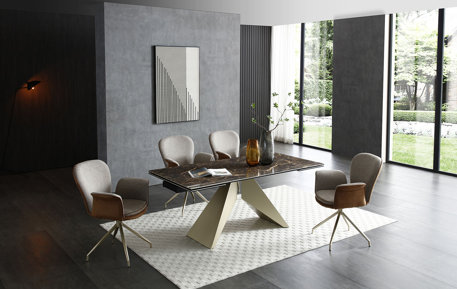 Обеденный стул Kimberly может вращаться на 180° и самостоятельно возвращаться в исходное положение, благодаря поворотно-возвратному механизму.